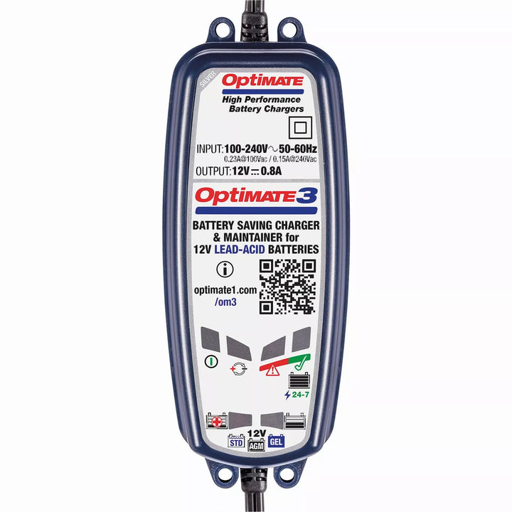 OptiMate 3: 7-step 12V 0.8A sealed battery saving charger & maintainer., The most trusted fully sealed battery saving charger & maintainer for your motorcycle, ATV, Side by Side or personal watercraft. The most popular motorcycle charger world-wide!, Charge, test and maintain your 12V AGM, GEL or STD battery. Keep it ready to ride!, If you forget, OptiMate 3 will save your ムdead flatメ sulphated battery from as low as 2V., Tests automatically: indicates if there is a battery problem., OptiMateメs 24-7 smart maintenance guarantees more battery power, longer battery life!
