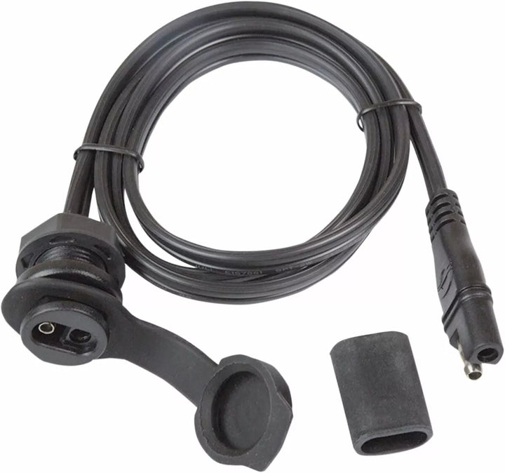Create a weatherproof panel mount SAE power point, Connector body fits a 18mm (23/32”) drilled hole, Front mount, rear fastener, for panel from 1mm / 0.040" thickness, Industry standard 2-pin SAE connector, Cable max. rating: 5 Amp, 40°C/-40°F very low temperature use; remains flexible at ‘below freezing’ temperatures, Includes in-line rubber seal for OptiMATE SAE connector