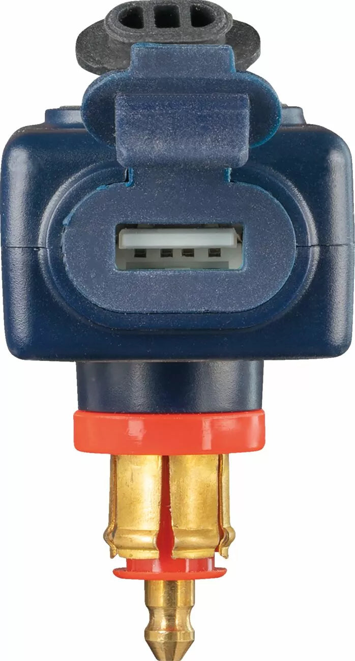 USB Smart 3300mA dual output charger, with BIKE socket., The portable 3300mA Dual USB charger with USB-A and USB-C port, with 90° elbow BIKE plug connector that fits your BMW and Triumph motorcycle – charge your phone, GPS, camera or tablet., 1x USB-A port and 1x USB-C port – 90° elbow DIN plug., Powerful 3300mA charge current delivered from USB-C port or current is shared if USB-A port is also used – Fast and safe recharging for all USB-C and USB-A devices., Works on your BMW or Triumph fitted with a modern 12V battery, lead-acid (Pb / AGM) or lithium-Ion (LiFePO4 / LFP) – does not drain the battery when vehicle is parked., Vehicle battery Volts = 13.3V: USB on., Built in protection turns off USB charging after 1 hour to prevent your parked vehicle’s battery from draining., Rated for normal T° and outdoor use.