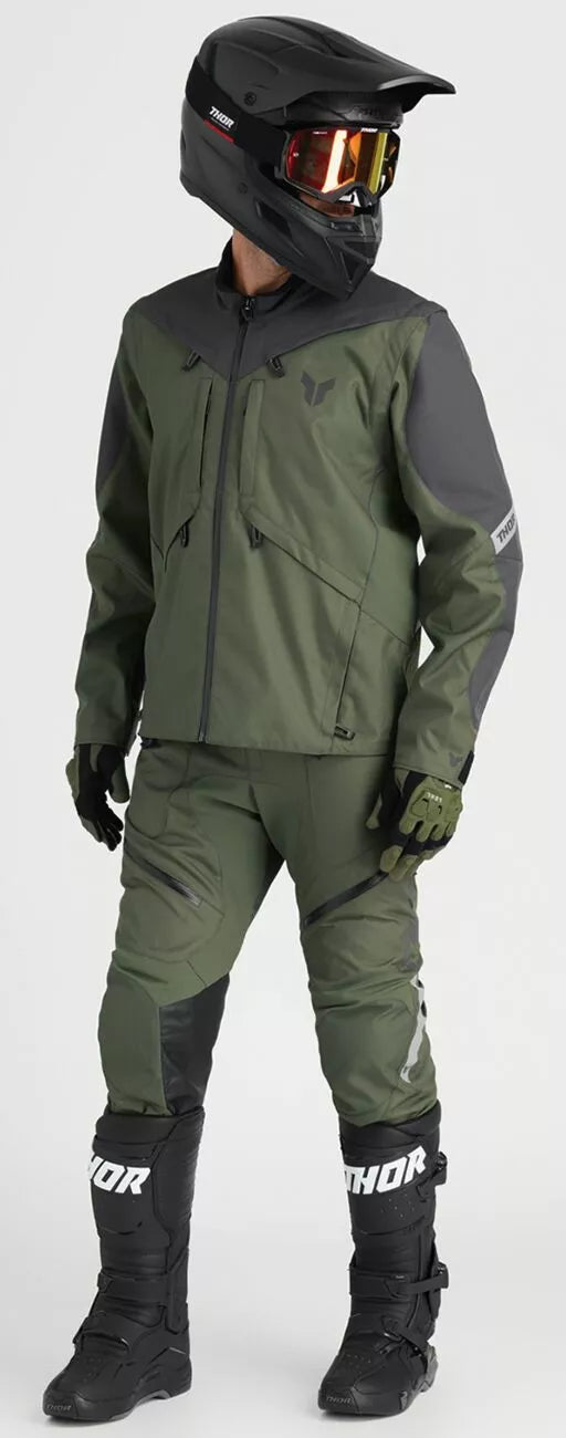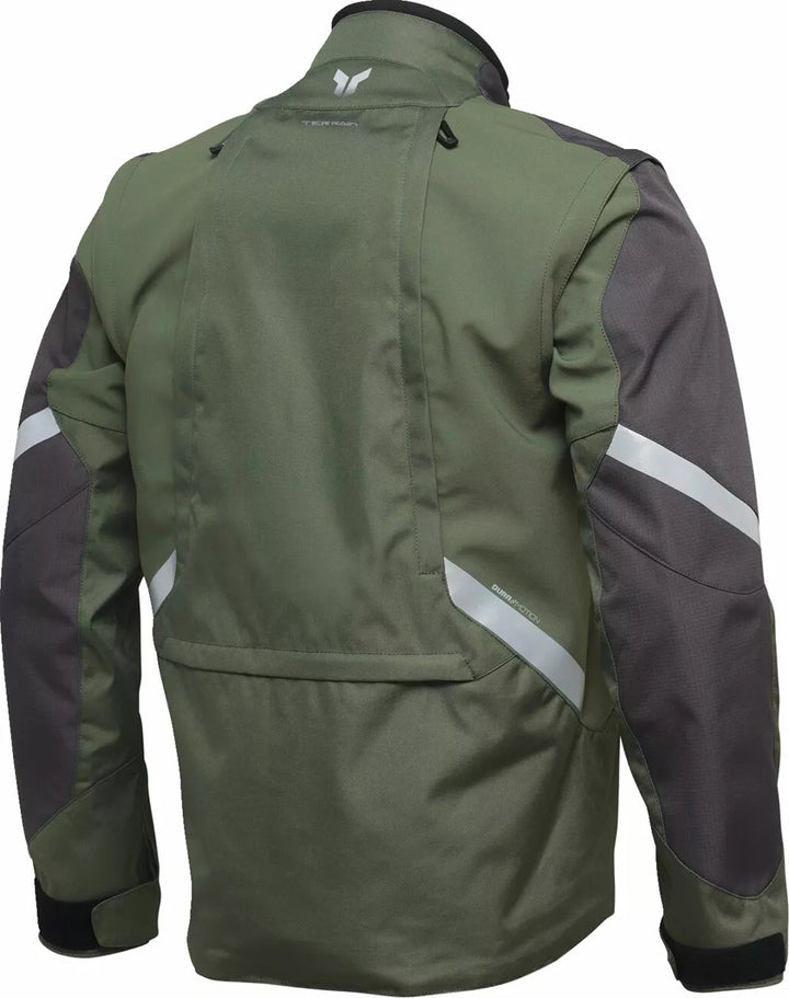 Rip-stop, abrasion resistant paneling on sleeves and shoulders, Three high-volume zippered pockets for trail essentials , Strategically placed zippered intake and exhaust vents , Dura-motion paneling provides flexibility without compromising durability , Taped zippers, DWR coating and Hipora membrane for increased water resistance , Zip-off sleeves with rear storage compartment, Jacket packs easily into belt for storage while riding , Reflective accents for increased visibility , Moisture wicking athletic mesh liner , Soft touch collar