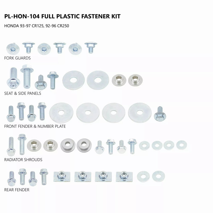 Includes all the factory replica fasteners and bushings for front fender, rear fender, front number plate, fork guards, seat, side panels and radiator shrouds in one set
