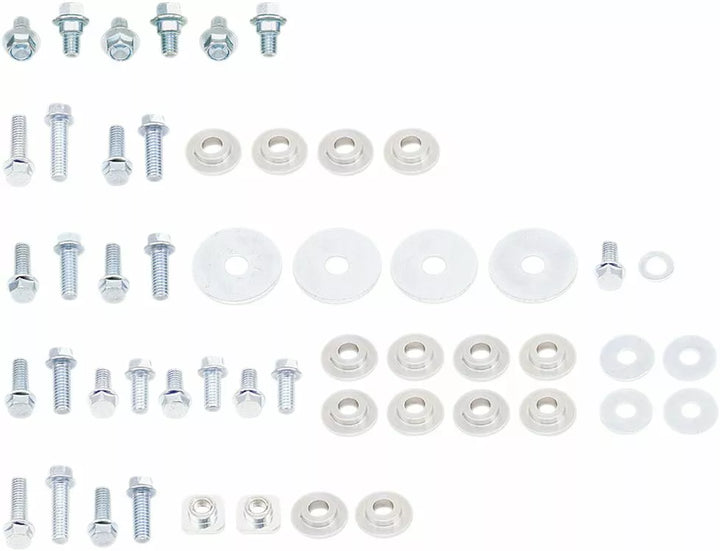 Includes all the factory replica fasteners and bushings for front fender, rear fender, front number plate, fork guards, seat, side panels and radiator shrouds in one set