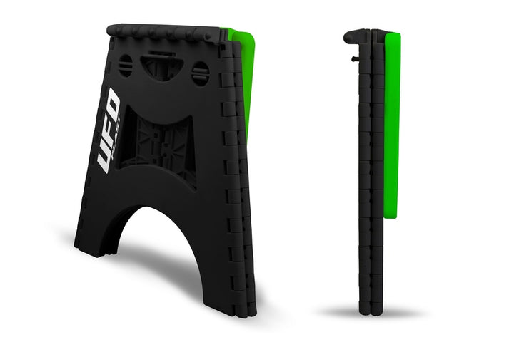 Foldable plastic bike stand Fully foldable to optimize space when not in use or during transportStructure made of nylon with fiberglassSolid construction offerinf maximum stability with a non-slip rubber support surfaceHandle for easy transportEasy opening and closing200kg capacity Color: Green