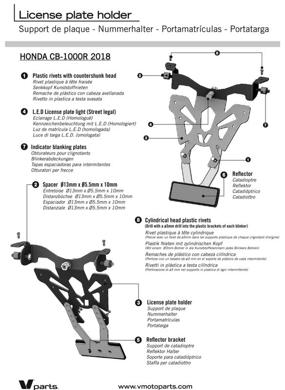V PARTS license plate holder are manufactured in France.Inconspicuous and perfectly finished, they are specifically developed for the attached bike application list. 2mm thin but sturdy steel license plate holder Black epoxy paintingCNC Manufactured – laser cut: precise finishHoles to fix license plate, indicators and license plate lightingMade in France Contents: Street legal license plate lighting, EU certifiedAdjustable reflector plateReflector, EU certified More info: Optimized and discreet cable passagewayFast & easy mountingAdjustable indicators bracketsFits EU platesIndicator lights spacing: 170 to 220mm Color: Black Material: Steel