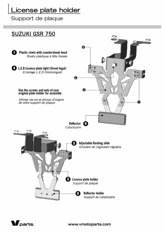 V PARTS license plate holder are manufactured in France.Inconspicuous and perfectly finished, they are specifically developed for the attached bike application list. 2mm thin but sturdy steel license plate holder Black epoxy paintingCNC Manufactured – laser cut: precise finishHoles to fix license plate, indicators and license plate lightingMade in France Contents: Street legal license plate lighting, EU certifiedAdjustable reflector plateReflector, EU certified More info: Optimized and discreet cable passagewayFast & easy mountingAdjustable indicators bracketsFits EU platesIndicator lights spacing: 170 to 220mm Color: Black Material: Steel