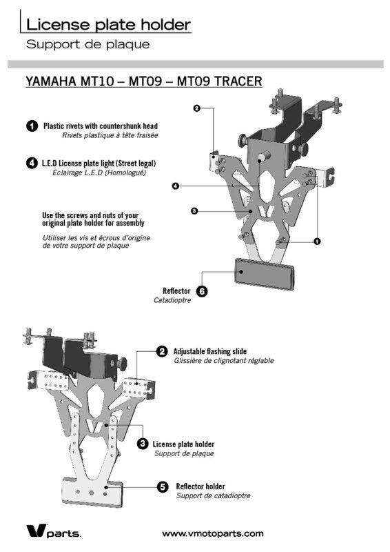 V PARTS license plate holder are manufactured in France.Inconspicuous and perfectly finished, they are specifically developed for the attached bike application list. 2mm thin but sturdy steel license plate holder Black epoxy paintingCNC Manufactured – laser cut: precise finishHoles to fix license plate, indicators and license plate lightingMade in France Contents: Street legal license plate lighting, EU certifiedAdjustable reflector plateReflector, EU certified More info: Optimized and discreet cable passagewayFast & easy mountingAdjustable indicators bracketsFits EU platesIndicator lights spacing: 170 to 220mm Color: Black Material: Steel