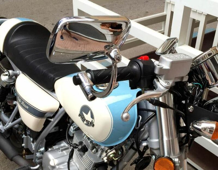 OEM type mirrorStreet legal Assembly: Handgrip Color: Chrome Fixing: Intérieur guidon Homologation: CE homologated Includes turn signal: Non Material: Plastique Mirror height (mm): 90.0 Mirror width (mm): 135.0 Position: Gauche + Droite Shape: Rectangle Thread direction: Right