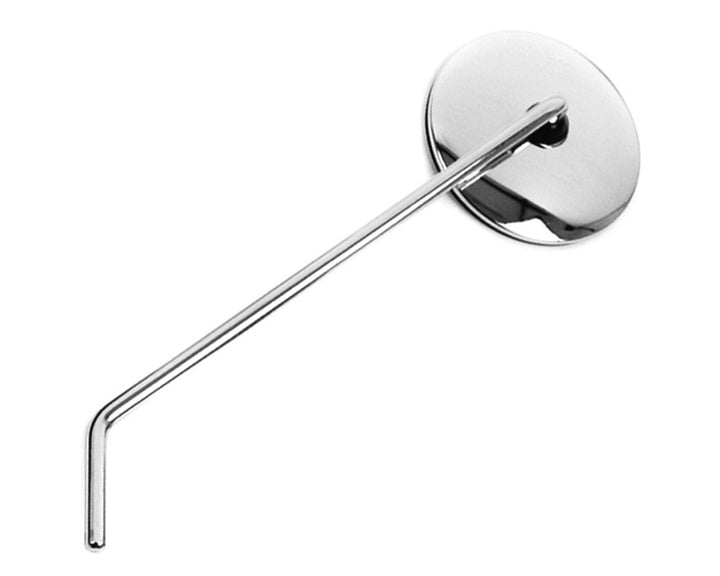 OEM type mirrorStreet legal Assembly: Handlebar Color: Chrome Fixing: Sans filetage Homologation: CE homologated Includes_turn_signal: Non Material: Plastique Mirror_height_mm: 125.0 Mirror_width_mm: 115.0 Packing: à l'unité Position: Gauche Shape: Round