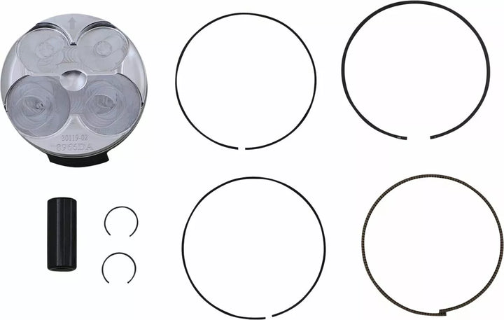 Enhanced piston pin oiling slots, radial boss machining, and annular grooves for improved wrist pin lubrication, Lightweight piston with a tight piston wall clearance for a quieter running engine, Skirt coated for reduced friction and improved break in performance, Ring land treatment for improved ring seal and oil control, Double bridged forging design where noted, Kit includes piston, rings, wrist pin and pin locks