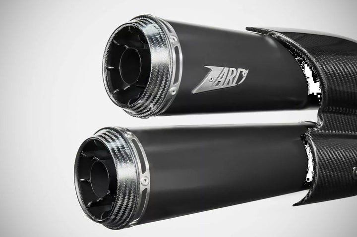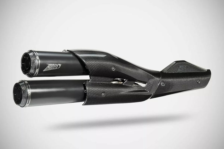 ZARD TOP GUN SLIP-ON 2:2 EXHAUST SYSTEM E5, Zard TOP GUN exhaust for the Harley-Davidsonᆴ Sportster S 1250 has been designed to give a new identity to the design of this modern power cruiser., Made entirely of AISI 304 stainless steel, this 2 in 1 in 2 slip-on kit is characterized by the body of the oval and streamlined silencers, with diagonally cut, carbon fiber end caps, in addition to the refined matte black Cerakoteᆴ finish and the Zard logo laser-engrave., The Zard モGTヤ exhaust for the Harley-Davidsonᆴ Sportster S 1250 is available in racing or Euro 5 homologated version and comes with the appropriate dB-Killer.., To complete this exhaust system, Zard has designed and manufactured an exclusive two-part carbon fiber heat shield that replaces the entire plastic unit of the original model and integrates perfectly into the bikeメs design, the result of extensive stylistic and aerodynamic research.