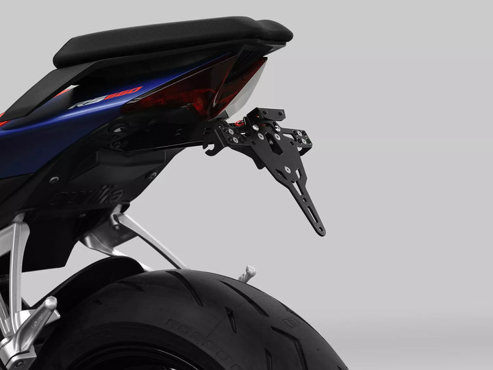 The license plate holder is extremely durable and weather proof., Black powder coated. , The license plate holder can be used for any kind of license plate (175mm Width)., No modification of fairing required., Stepless adjustment of rake angle., Indicator supports adjustable in 3 positions., Very good fit, sporty look., Countersunk bolts for flush mount of the license plate., Special indicator light mounts (sold separately) required for stock indicator lights., Kit includes:, 1 license plate holder incl. mounting kit., LED license plate light "E approved" incl. support., Back light with support., Type A (DE) fits the corresponding license plate sizes of: Germany, Slovenia, Croatia & UK.