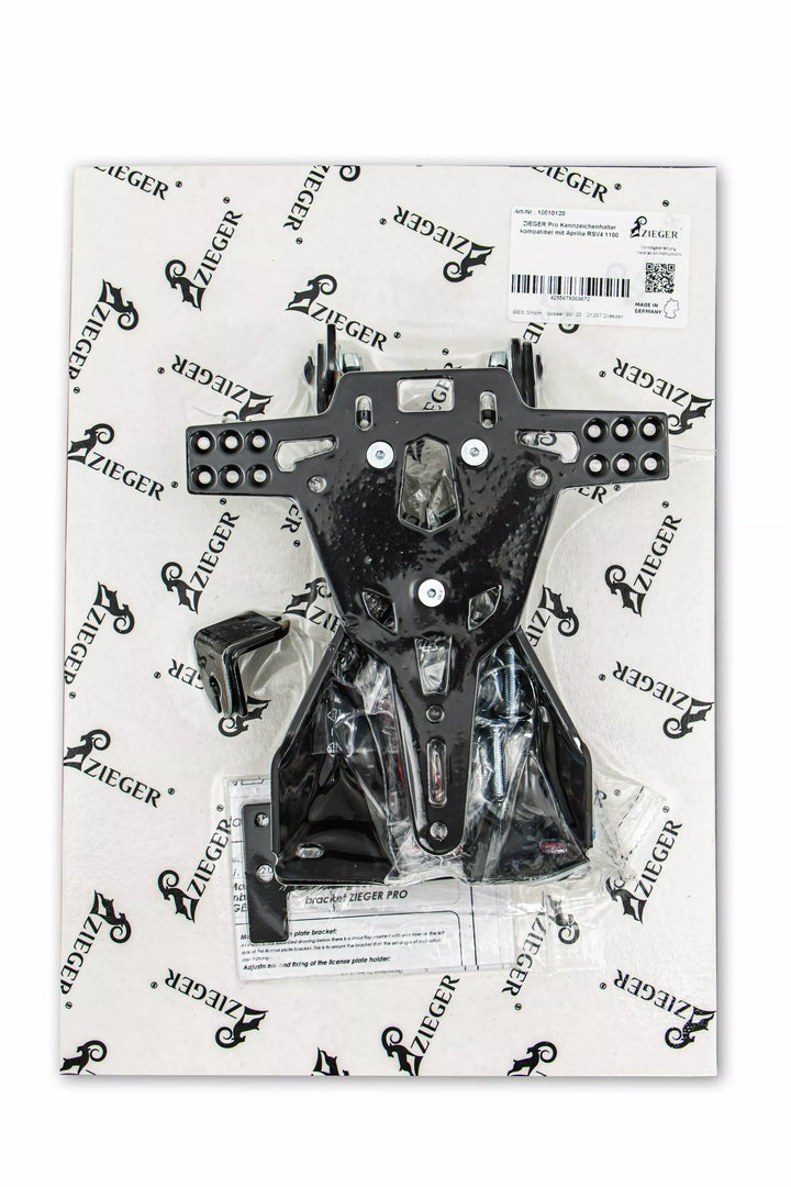 The license plate holder is extremely durable and weather proof., Black powder coated. , The license plate holder can be used for any kind of license plate (175mm Width)., No modification of fairing required., Stepless adjustment of rake angle., Indicator supports adjustable in 3 positions., Very good fit, sporty look., Countersunk bolts for flush mount of the license plate., Special indicator light mounts (sold separately) required for stock indicator lights., Kit includes:, 1 license plate holder incl. mounting kit., LED license plate light "E approved" incl. support., Back light with support., Type A (DE) fits the corresponding license plate sizes of: Germany, Slovenia, Croatia & UK.