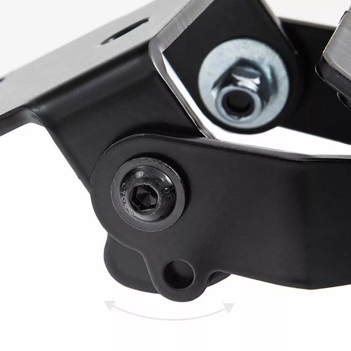 The license plate holder is extremely durable and weather proof., Black powder coated. , The license plate holder can be used for any kind of license plate (175mm Width)., No modification of fairing required., Stepless adjustment of rake angle., Indicator supports adjustable in 3 positions., Very good fit, sporty look., Countersunk bolts for flush mount of the license plate., Special indicator light mounts (sold separately) required for stock indicator lights., Kit includes:, 1 license plate holder incl. mounting kit., LED license plate light "E approved" incl. support., Back light with support., Type A (DE) fits the corresponding license plate sizes of: Germany, Slovenia, Croatia & UK.