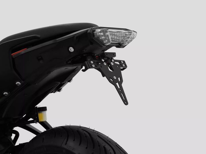 The license plate holder is extremely durable and weather proof., Black powder coated. , The license plate holder can be used for any kind of license plate (175mm Width)., No modification of fairing required., Stepless adjustment of rake angle., Indicator supports adjustable in 3 positions., Very good fit, sporty look., Countersunk bolts for flush mount of the license plate., Special indicator light mounts (sold separately) required for stock indicator lights., Kit includes:, 1 license plate holder incl. mounting kit., LED license plate light "E approved" incl. support., Back light with support., Type A (DE) fits the corresponding license plate sizes of: Germany, Slovenia, Croatia & UK.
