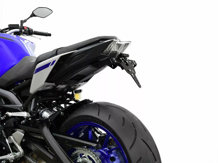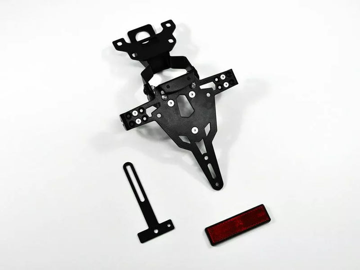 The license plate holder is extremely durable and weather proof., Black powder coated. , The license plate holder can be used for any kind of license plate (175mm Width)., No modification of fairing required., Stepless adjustment of rake angle., Indicator supports adjustable in 3 positions., Very good fit, sporty look., Countersunk bolts for flush mount of the license plate., Special indicator light mounts (sold separately) required for stock indicator lights., Kit includes:, 1 license plate holder incl. mounting kit., LED license plate light "E approved" incl. support., Back light with support., Type B (AT) fits Austria License Plates.