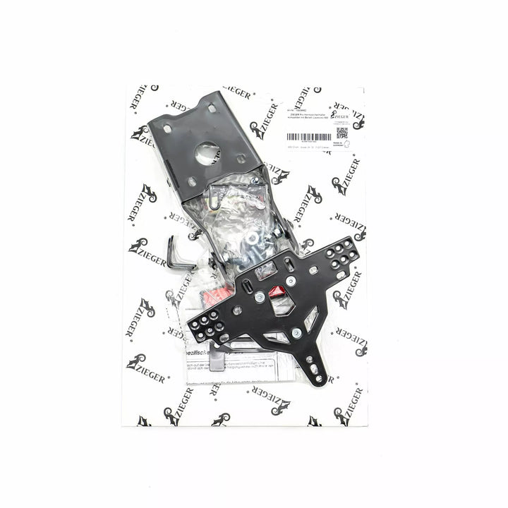 The license plate holder is extremely durable and weather proof., Black powder coated. , The license plate holder can be used for any kind of license plate (175mm Width)., No modification of fairing required., Stepless adjustment of rake angle., Indicator supports adjustable in 3 positions., Very good fit, sporty look., Countersunk bolts for flush mount of the license plate., Special indicator light mounts (sold separately) required for stock indicator lights., Kit includes:, 1 license plate holder incl. mounting kit., LED license plate light "E approved" incl. support., Back light with support., Type C (CH) fits the corresponding license plate sizes of: Switzerland, Poland and Ireland.