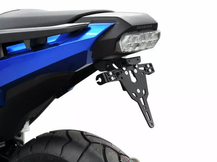 The license plate holder is extremely durable and weather proof., Black powder coated. , The license plate holder can be used for any kind of license plate (175mm Width)., No modification of fairing required., Stepless adjustment of rake angle., Indicator supports adjustable in 3 positions., Very good fit, sporty look., Countersunk bolts for flush mount of the license plate., Special indicator light mounts (sold separately) required for stock indicator lights., Kit includes:, 1 license plate holder incl. mounting kit., LED license plate light "E approved" incl. support., Back light with support., Type C (CH) fits the corresponding license plate sizes of: Switzerland, Poland and Ireland.