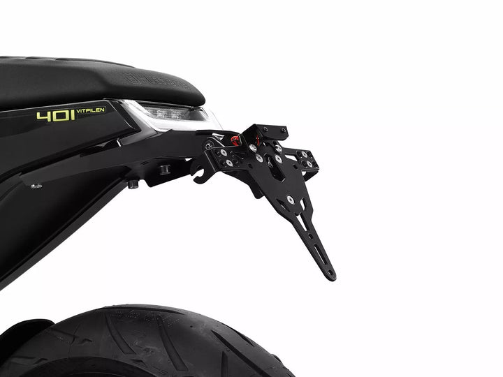 The license plate holder is extremely durable and weather proof., Black powder coated. , The license plate holder can be used for any kind of license plate (175mm Width)., No modification of fairing required., Stepless adjustment of rake angle., Indicator supports adjustable in 3 positions., Very good fit, sporty look., Countersunk bolts for flush mount of the license plate., Special indicator light mounts (sold separately) required for stock indicator lights., Kit includes:, 1 license plate holder incl. mounting kit., LED license plate light "E approved" incl. support., Back light with support., Type D (FR) fits France license plates.