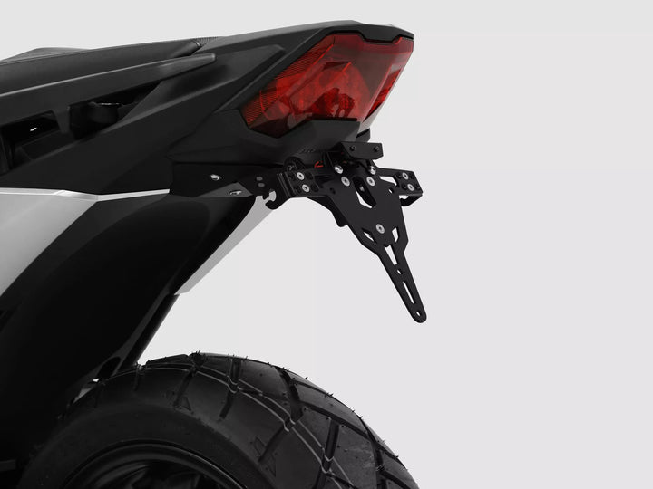 The license plate holder is extremely durable and weather proof., Black powder coated. , The license plate holder can be used for any kind of license plate (175mm Width)., No modification of fairing required., Stepless adjustment of rake angle., Indicator supports adjustable in 3 positions., Very good fit, sporty look., Countersunk bolts for flush mount of the license plate., Special indicator light mounts (sold separately) required for stock indicator lights., Kit includes:, 1 license plate holder incl. mounting kit., LED license plate light "E approved" incl. support., Back light with support., Type D (FR) fits France license plates.