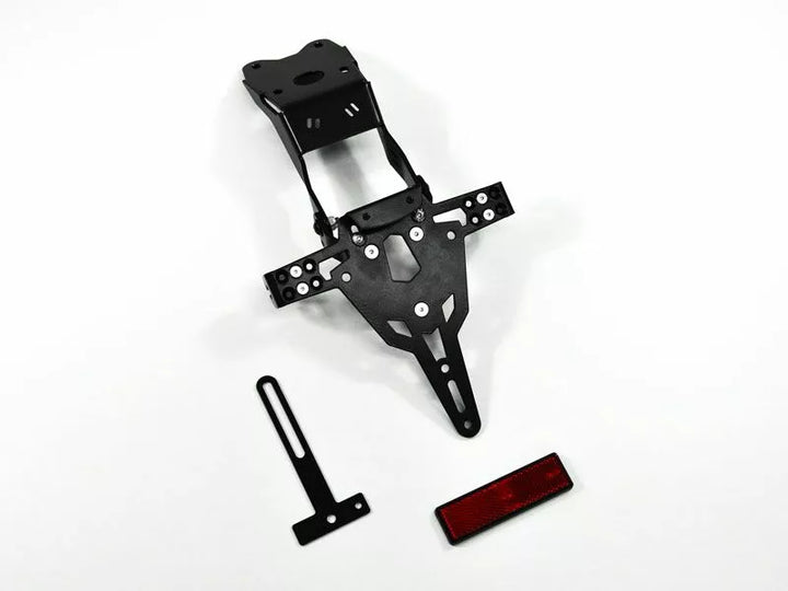 The license plate holder is extremely durable and weather proof., Black powder coated. , The license plate holder can be used for any kind of license plate (175mm Width)., No modification of fairing required., Stepless adjustment of rake angle., Indicator supports adjustable in 3 positions., Very good fit, sporty look., Countersunk bolts for flush mount of the license plate., Special indicator light mounts (sold separately) required for stock indicator lights., Kit includes:, 1 license plate holder incl. mounting kit., LED license plate light "E approved" incl. support., Back light with support., Type D (FR) fits France license plates.