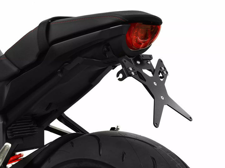 The license plate holder is extremely durable and weather proof., Black powder coated. , The license plate holder can be used for any kind of license plate (175mm Width)., No modification of fairing required., Stepless adjustment of rake angle., Indicator supports adjustable in 3 positions., Very good fit, sporty look., Countersunk bolts for flush mount of the license plate., Special indicator light mounts (sold separately) required for stock indicator lights., Kit includes:, 1 license plate holder incl. mounting kit., LED license plate light "E approved" incl. support., Back light with support., Type E fits Italian and German license plates., DISCLAIMER: Important: For the use of this license plate holder with the OEM turn signals of Ducati models (2015 - Present) a special holder is needed (Zieger Turn Signal Adapter OE Duc. Parts Europe Part Number: 20301971. Vendor Number: 10005790).