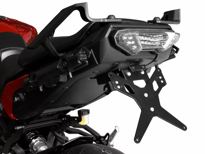 The license plate holder is extremely durable and weather proof., Black powder coated. , The license plate holder can be used for any kind of license plate (175mm Width)., No modification of fairing required., Stepless adjustment of rake angle., Indicator supports adjustable in 3 positions., Very good fit, sporty look., Countersunk bolts for flush mount of the license plate., Special indicator light mounts (sold separately) required for stock indicator lights., Kit includes:, 1 license plate holder incl. mounting kit., LED license plate light "E approved" incl. support., Back light with support., Type E fits Italian and German license plates., DISCLAIMER: Important: For the use of this license plate holder with the OEM turn signals of Ducati models (2015 - Present) a special holder is needed (Zieger Turn Signal Adapter OE Duc. Parts Europe Part Number: 20301971. Vendor Number: 10005790).