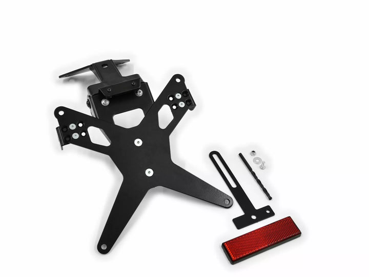 The license plate holder is extremely durable and weather proof., Black powder coated. , The license plate holder can be used for any kind of license plate (175mm Width)., No modification of fairing required., Stepless adjustment of rake angle., Indicator supports adjustable in 3 positions., Very good fit, sporty look., Countersunk bolts for flush mount of the license plate., Special indicator light mounts (sold separately) required for stock indicator lights., Kit includes:, 1 license plate holder incl. mounting kit., LED license plate light "E approved" incl. support., Back light with support., Type E fits Italian and German license plates., DISCLAIMER: Important: For the use of this license plate holder with the OEM turn signals of Ducati models (2015 - Present) a special holder is needed (Zieger Turn Signal Adapter OE Duc. Parts Europe Part Number: 20301971. Vendor Number: 10005790).