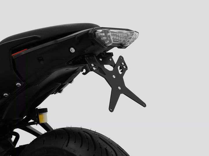 The license plate holder is extremely durable and weather proof., Black powder coated. , The license plate holder can be used for any kind of license plate (175mm Width)., No modification of fairing required., Stepless adjustment of rake angle., Indicator supports adjustable in 3 positions., Very good fit, sporty look., Countersunk bolts for flush mount of the license plate., Special indicator light mounts (sold separately) required for stock indicator lights., Kit includes:, 1 license plate holder incl. mounting kit., LED license plate light "E approved" incl. support., Back light with support., Type E fits Italian and German license plates., DISCLAIMER: Important: For the use of this license plate holder with the OEM turn signals of Ducati models (2015 - Present) a special holder is needed (Zieger Turn Signal Adapter OE Duc. Parts Europe Part Number: 20301971. Vendor Number: 10005790).