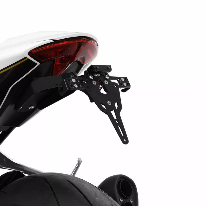 The license plate holder is extremely durable and weather proof., Black powder coated. , The license plate holder can be used for any kind of license plate (175mm Width)., No modification of fairing required., Stepless adjustment of rake angle., Indicator supports adjustable in 3 positions., Very good fit, sporty look., Countersunk bolts for flush mount of the license plate., Special indicator light mounts (sold separately) required for stock indicator lights., Kit includes:, 1 license plate holder incl. mounting kit., LED license plate light "E approved" incl. support., Back light with support., Type B (AT) fits Austria License Plates.