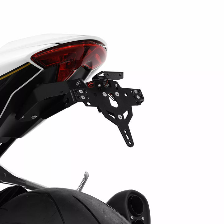 The license plate holder is extremely durable and weather proof., Black powder coated. , The license plate holder can be used for any kind of license plate (175mm Width)., No modification of fairing required., Stepless adjustment of rake angle., Indicator supports adjustable in 3 positions., Very good fit, sporty look., Countersunk bolts for flush mount of the license plate., Special indicator light mounts (sold separately) required for stock indicator lights., Kit includes:, 1 license plate holder incl. mounting kit., LED license plate light "E approved" incl. support., Back light with support., Type C (CH) fits the corresponding license plate sizes of: Switzerland, Poland and Ireland.