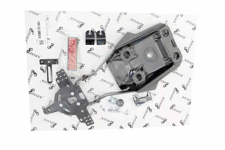The license plate holder is extremely durable and weather proof., Black powder coated. , The license plate holder can be used for any kind of license plate (175mm Width)., No modification of fairing required., Stepless adjustment of rake angle., Indicator supports adjustable in 3 positions., Very good fit, sporty look., Countersunk bolts for flush mount of the license plate., Special indicator light mounts (sold separately) required for stock indicator lights., Kit includes:, 1 license plate holder incl. mounting kit., LED license plate light "E approved" incl. support., Back light with support., Type C (CH) fits the corresponding license plate sizes of: Switzerland, Poland and Ireland.