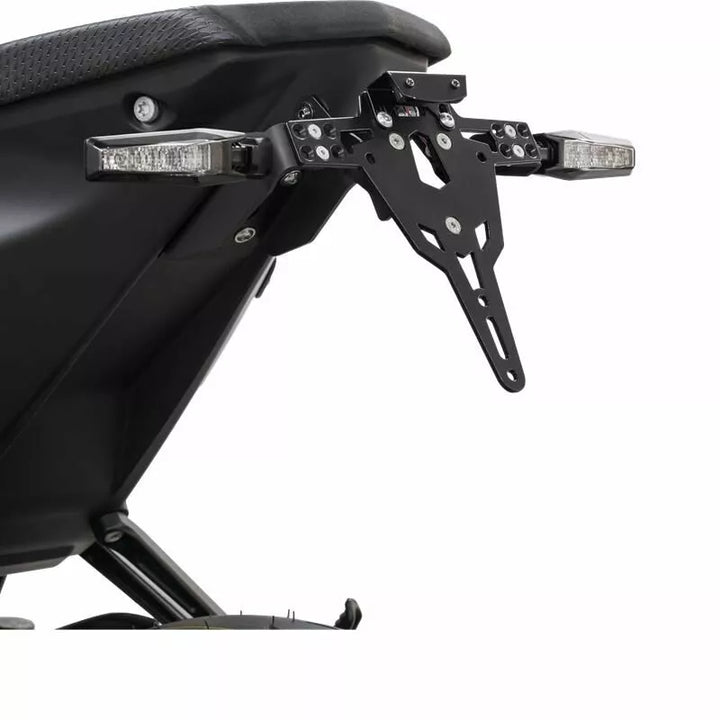 The license plate holder is extremely durable and weather proof., Black powder coated. , The license plate holder can be used for any kind of license plate (175mm Width)., No modification of fairing required., Stepless adjustment of rake angle., Indicator supports adjustable in 3 positions., Very good fit, sporty look., Countersunk bolts for flush mount of the license plate., Special indicator light mounts (sold separately) required for stock indicator lights., Kit includes:, 1 license plate holder incl. mounting kit., LED license plate light "E approved" incl. support., Back light with support., Type B (AT) fits Austria License Plates.
